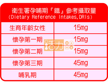衛生署建議媽咪懷孕第三期(懷孕七個月)要特別加強鐵的攝取,一般生育年齡女性建議每天攝取15毫克的鐵,到懷孕第三期則要增加到每天45毫克。